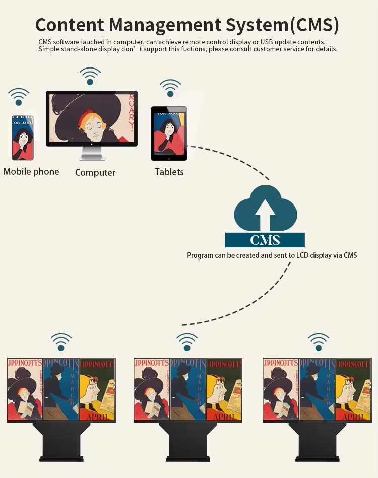 도로의 보행자 및 차량의 경우 75 인치 대형 4K 광고 프로모션 및 정보 표시가 제안되었습니다. 동시에 매일지도 및 정보 쿼리를 제공 할 수 있습니다.